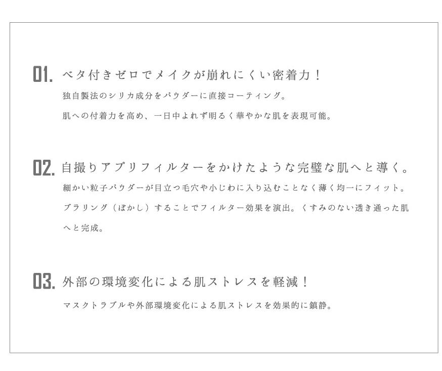 にじまず、ベタ付かず、透明感のあるきれいな肌に仕上げるパウダーが、日常化したマスクの着用の中でメイクが崩れないように高いキープ力でメイクを維持させます。