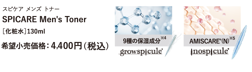男性の肌は、皮脂が多く見えても内側は乾きがち。乾燥は毛穴の開きなどの原因になるため、保湿が欠かせません。メンズトナーは、シェービング後の敏感な肌に清涼感とうるおいを与える化粧水。グロウスピキュールが保湿成分を抱え、肌の奥※3まで届けます。