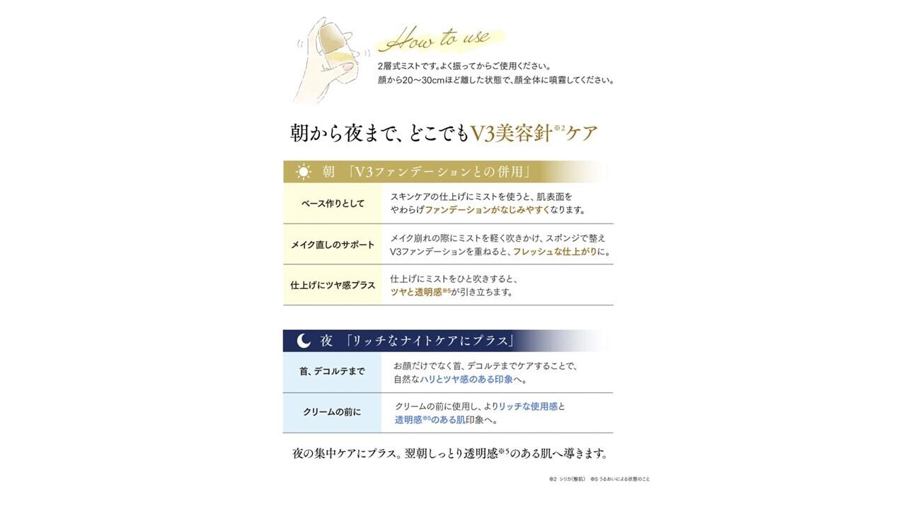 振るたびにオイルのツヤとウォーターの透明感が融合し、しっとりみずみずしい理想の仕上がりに。